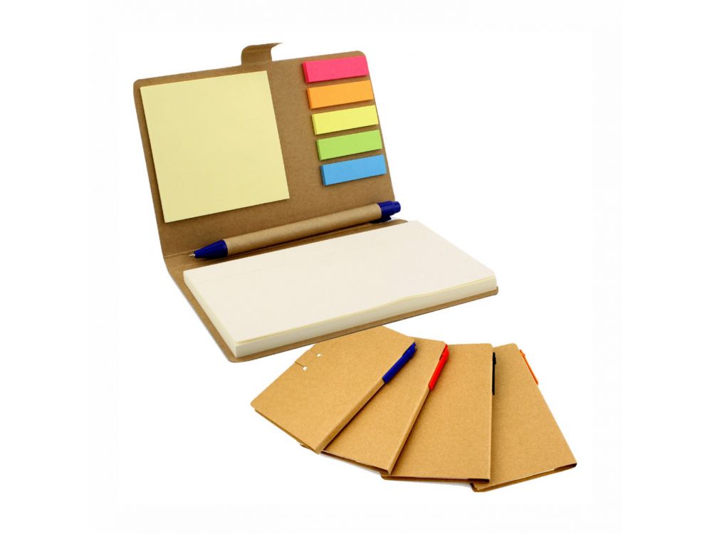 Bloco de anotações ecológico, material em kraft.Tam: 10,3x15,3cm. Possui uma trava na própria capa, cinco blocos auto-colantes coloridos com aproximadamente 25 folhinhas, bloco de post-it amarelo com aproximadamente 25 folhas e bloco grande com aproximadamente 70 folhas. NÃO ACOMPANHA CANETA.